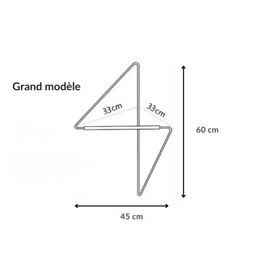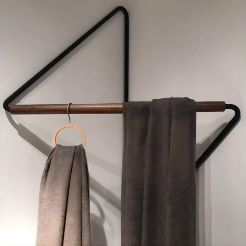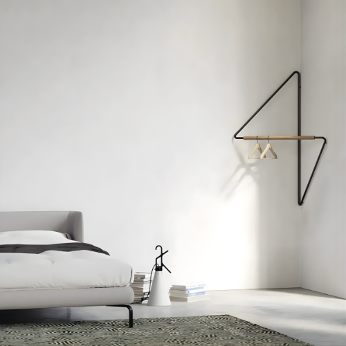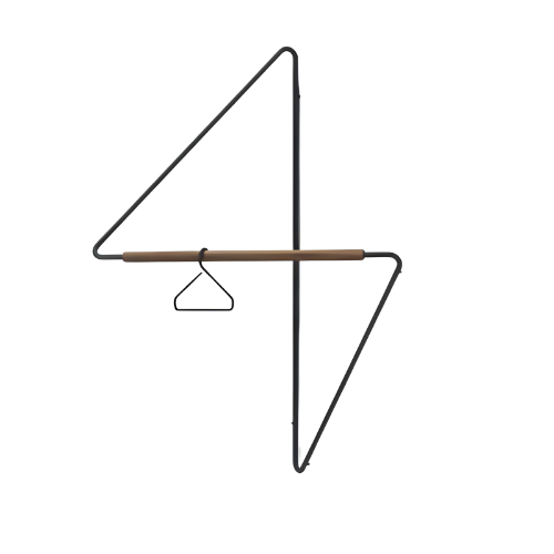 Ce portant en métal noir à la silhouette triangulaire s’installe directement dans un coin de pièce, transformant un angle inutilisé en un espace de rangement fonctionnel. Sa tringle en bois naturel crée un contraste chaleureux et apporte une touche de sophistication à ce design architectural.