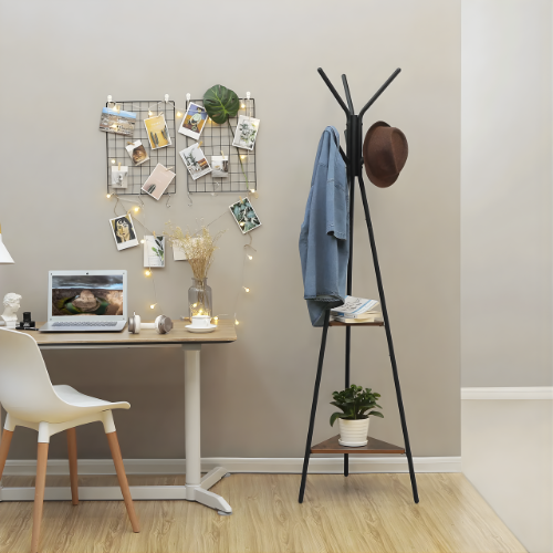 Compact mais fonctionnel, ce porte-manteau est idéal pour les petites surfaces. Il libère de l’espace dans les placards tout en gardant vos essentiels accessibles à portée de main. Les étagères inférieures accueillent paniers, chaussures ou plantes pour une touche déco.