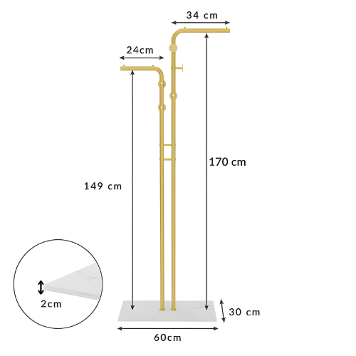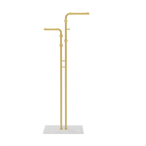 La structure est conçue en acier laqué or, à la fois résistante aux chocs et facile à nettoyer. Le socle en MDF au fini marbré offre une excellente assise et protège votre sol des rayures. Les crochets galbés, équipés d’embouts ronds, permettent de suspendre vos vêtements sans risque de les abîmer.