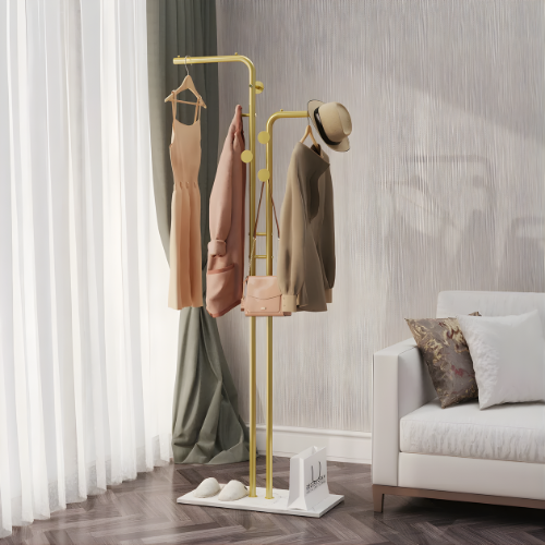 Alliant lignes épurées et teinte dorée raffinée, ce porte-manteau habille votre entrée ou votre salon d'une touche d’élégance moderne. Il accueille manteaux, sacs, chapeaux, foulards et parapluies avec style, tout en s’intégrant harmonieusement à une décoration contemporaine.