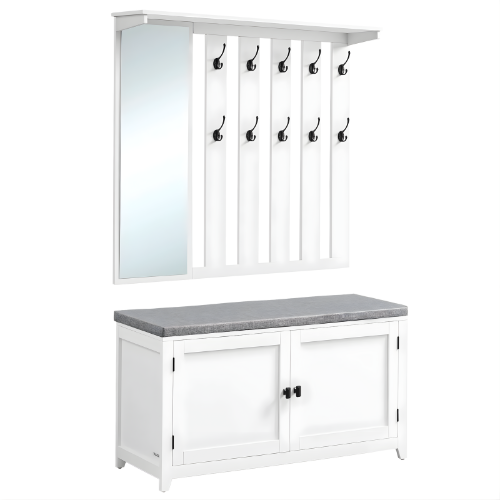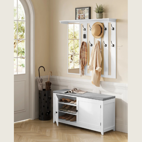Ce meuble d’entrée multifonction associe banc rembourré, penderie, étagères de rangement, rangement chaussures, porte-parapluies et porte-accessoires. Idéal pour poser vos sacs, vestes, chapeaux et chaussures au quotidien, il rend votre entrée plus accueillante et fonctionnelle.