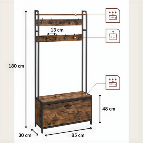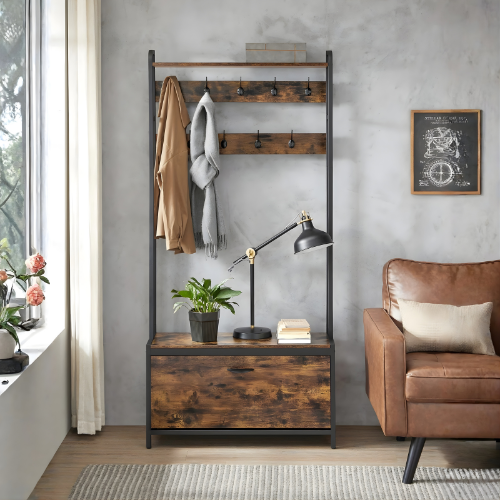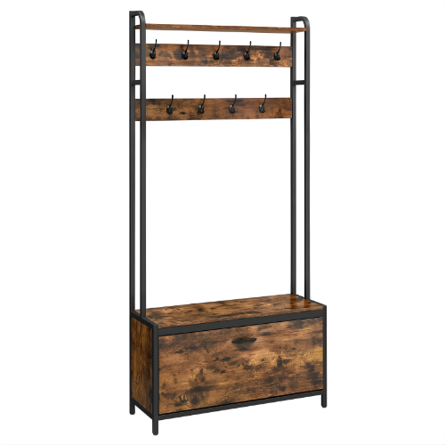 Ce vestiaire au design industriel associe structure en métal noir et panneaux effet bois vieilli, pour une entrée chaleureuse et fonctionnelle. Sa forme épurée offre une solution parfaite pour accrocher manteaux, écharpes, sacs ou chapeaux, tout en intégrant un espace de rangement bas généreux.