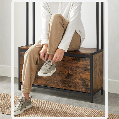 Ce meuble polyvalent allie fonctionnalité et gain de place grâce à ses 4 crochets muraux robustes qui permettent de suspendre manteaux, sacs ou écharpes, et sa banquette basse dotée d’un grand coffre de rangement idéal pour les chaussures, accessoires ou gants. Ses lignes géométriques épurées s’intègrent harmonieusement aussi bien dans une entrée étroite que dans un bureau ou un couloir.